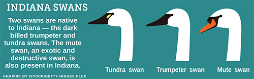 The exotic and destructive mute swan is also present in Indiana. Trumpeter and tundra swans can be distinguished from mute swans because they have a mostly black or all-black bill, whereas adult mute swans have a bright orange bill. Also, mute swans have a large black knob at the base of the bill native swans lack.
