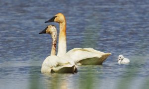 trumpeter swan family By Richard G. Biever Posted on Sep 25 2017 in Two swans and a baby swimming in water.