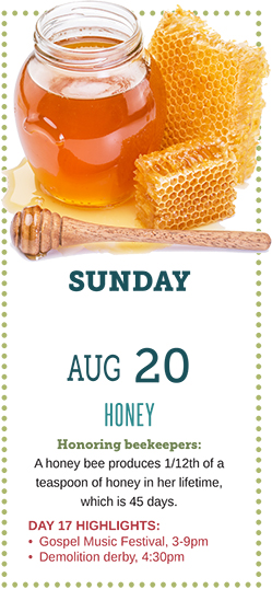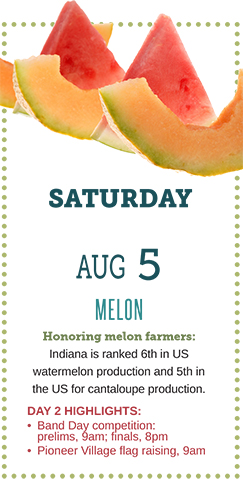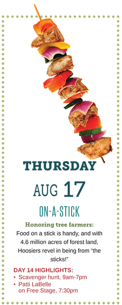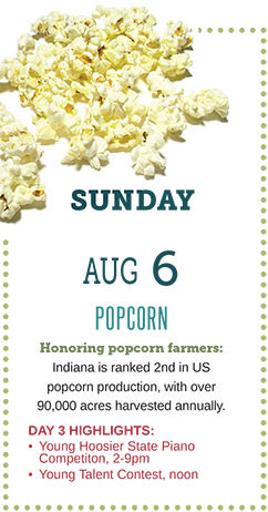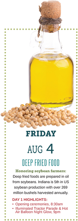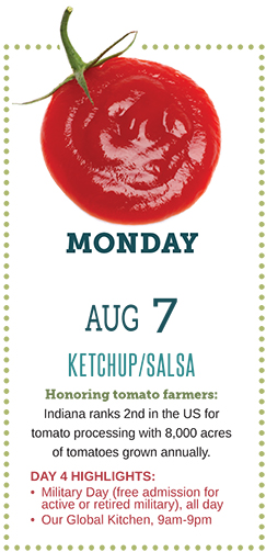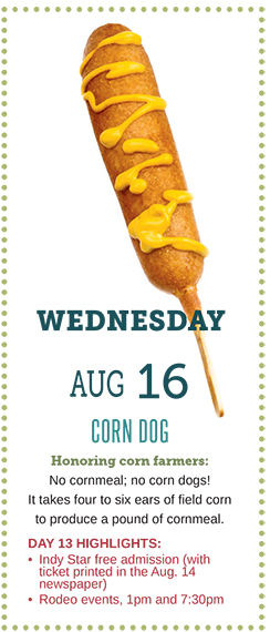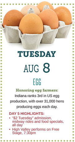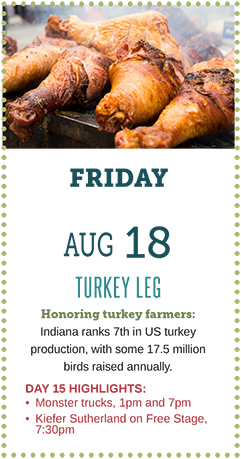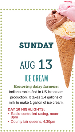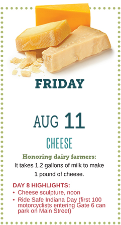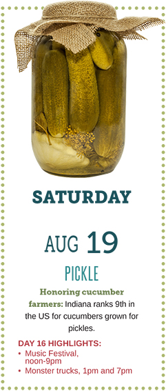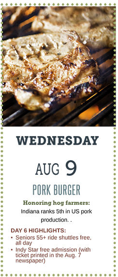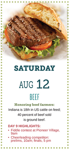 Each day at the fair this year celebrates a different kind of food and the Indiana farmers/growers/producers that help make it possible. Here’s the run down for all 17 days, along with some of the day’s highlights: