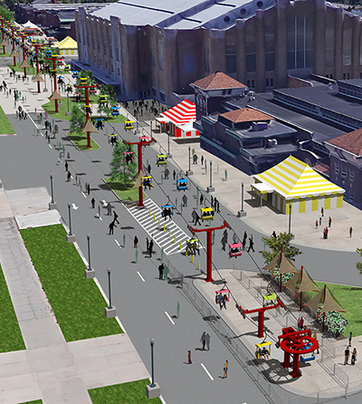 The attraction is similar to a ski chairlift. Rising approximately 35 feet above the ground over the span of 1,400 feet, the 90-chair aerial lift will travel east and west in a continuous loop down Main Street.