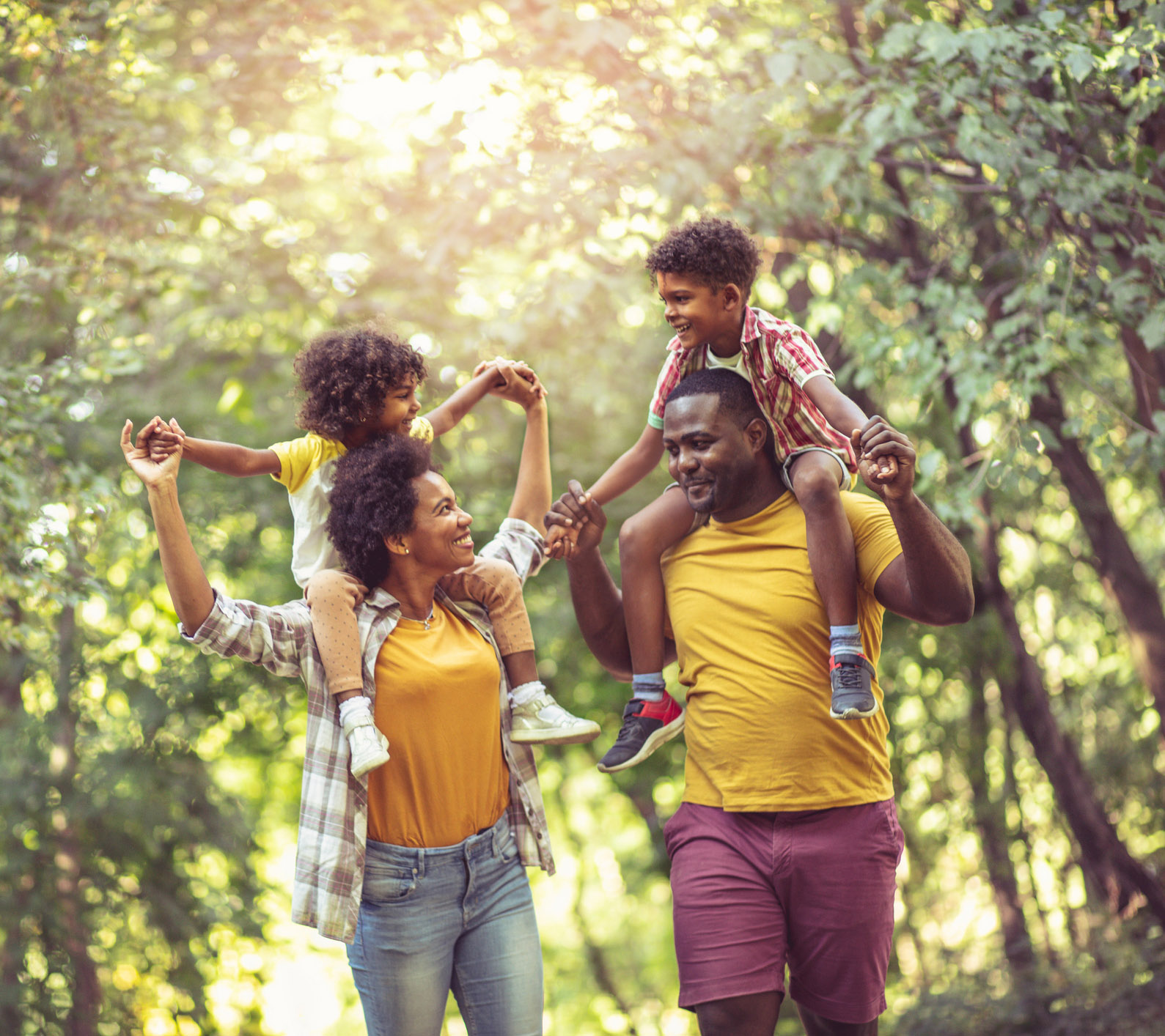 African American family walking trough park. Parents carrying children on piggyback. By hhuffman Posted on May 26 2023 in
