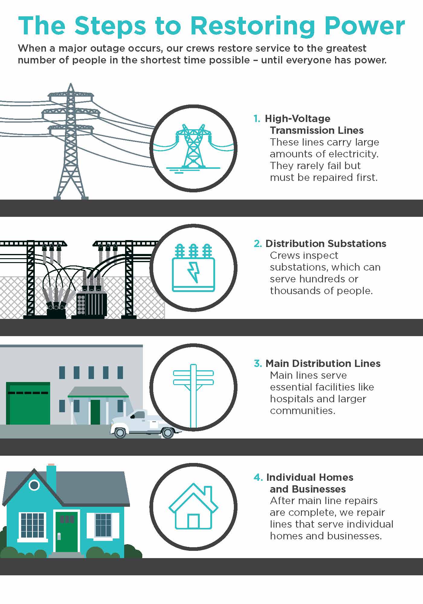 These are the lines that run from substations to neighborhoods, towns, and essential facilities, such as schools, hospitals, and water treatment plants. We prioritize repairs to these areas next to bring service back to large groups of members.