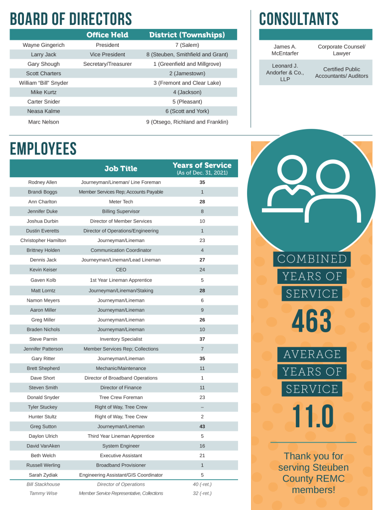 Steuben County REMC director and staff listing By Indiana Connection Posted on May 06 2022 in Steuben County REMC Related Stories Want to serve your community? Broadband internet for your home and business from Steuben County REMC Calendar