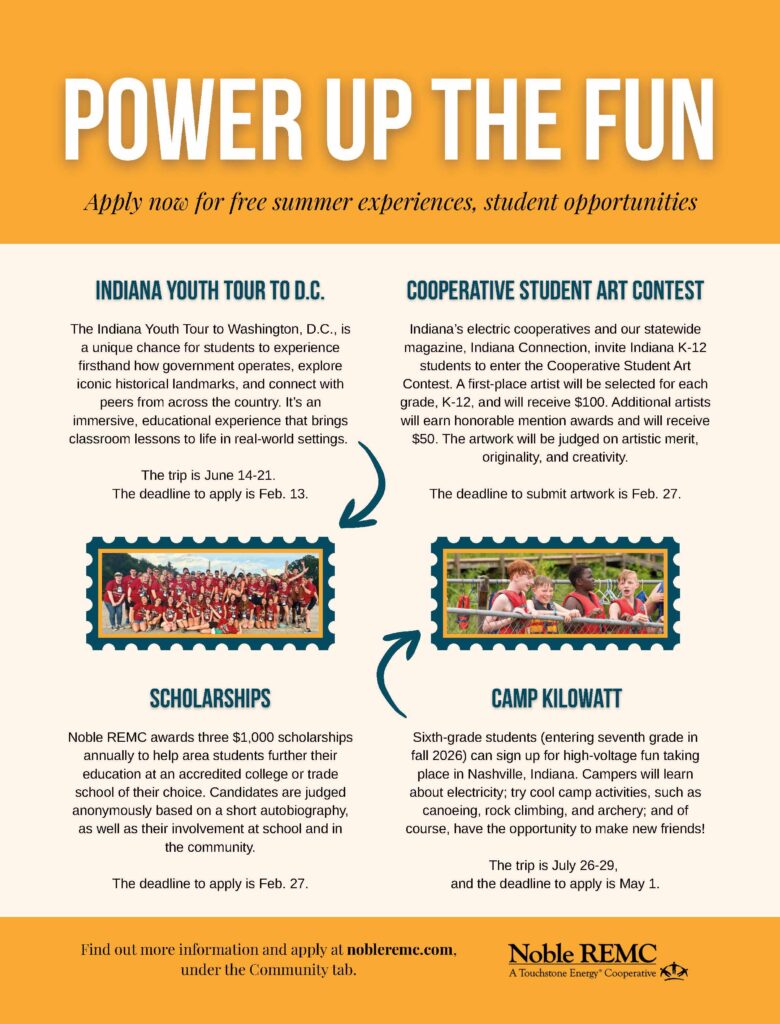 Students: Power up the fun this summer with our youth programs By Indiana Connection Posted on Feb 22 2026 in Noble REMC Related Stories Build the co-op’s future on our board Battery installation protects reliability Powering change through our EnviroWatts grants