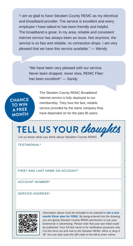 Tell us your thoughts By Indiana Connection Posted on Feb 16 2025 in Steuben County REMC Related Stories Want to serve your community? Broadband internet for your home and business from Steuben County REMC Calendar