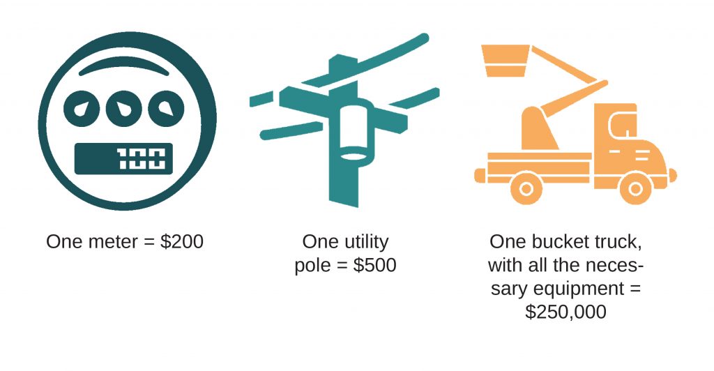 These fixed costs go toward the purchases and maintenance of the illustrated items below — and more — on behalf of each member. We all need a reliable energy grid, so we all share in the costs of building and maintaining it, regardless of how much energy we consume.