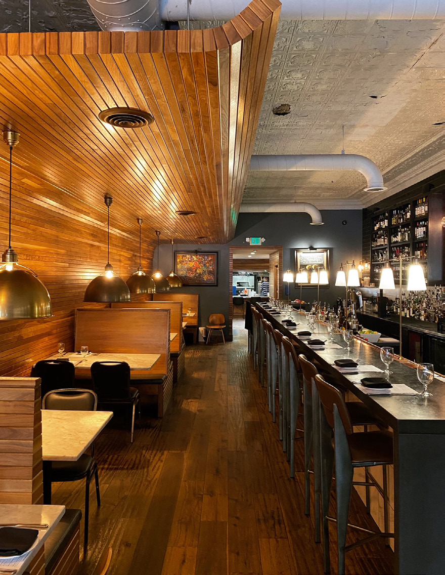 Nikki Sutton of Blackline Studio designed Henry Social Club with an intimate “dark and sexy” vibe. The restaurant has an open concept where guests can see into the kitchen, seating for 75 inside and 12 outdoors, and a “Clandestine Room” downstairs for private functions for about 20 guests.