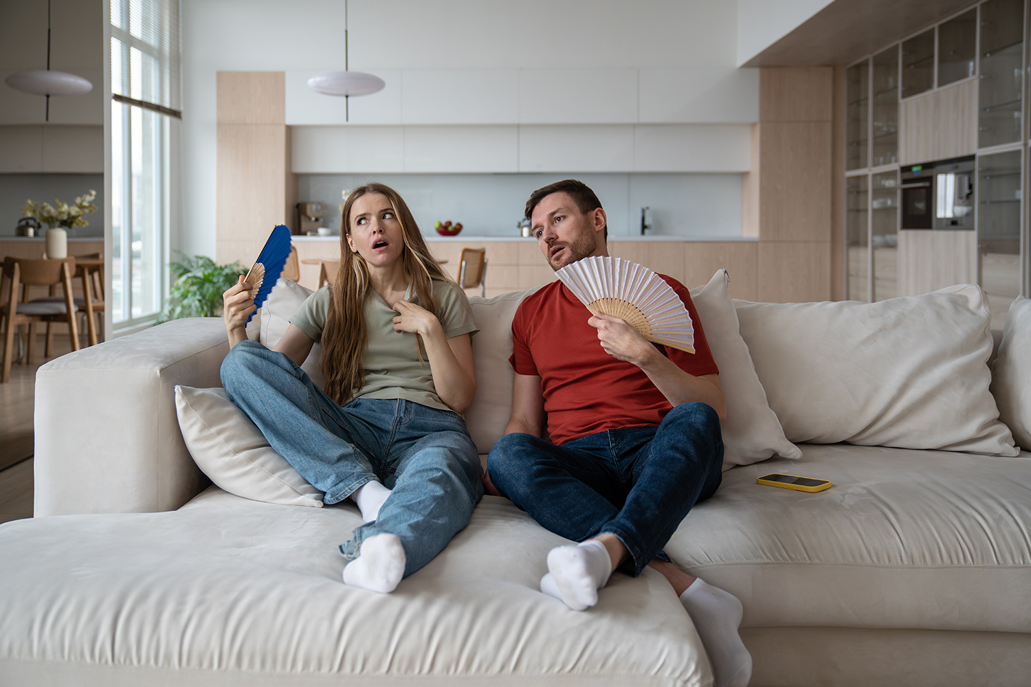 Exhausted couple sitting at home waving with hand fans, suffering from extreme high air temperature By hhuffman Posted on May 27 2025 in