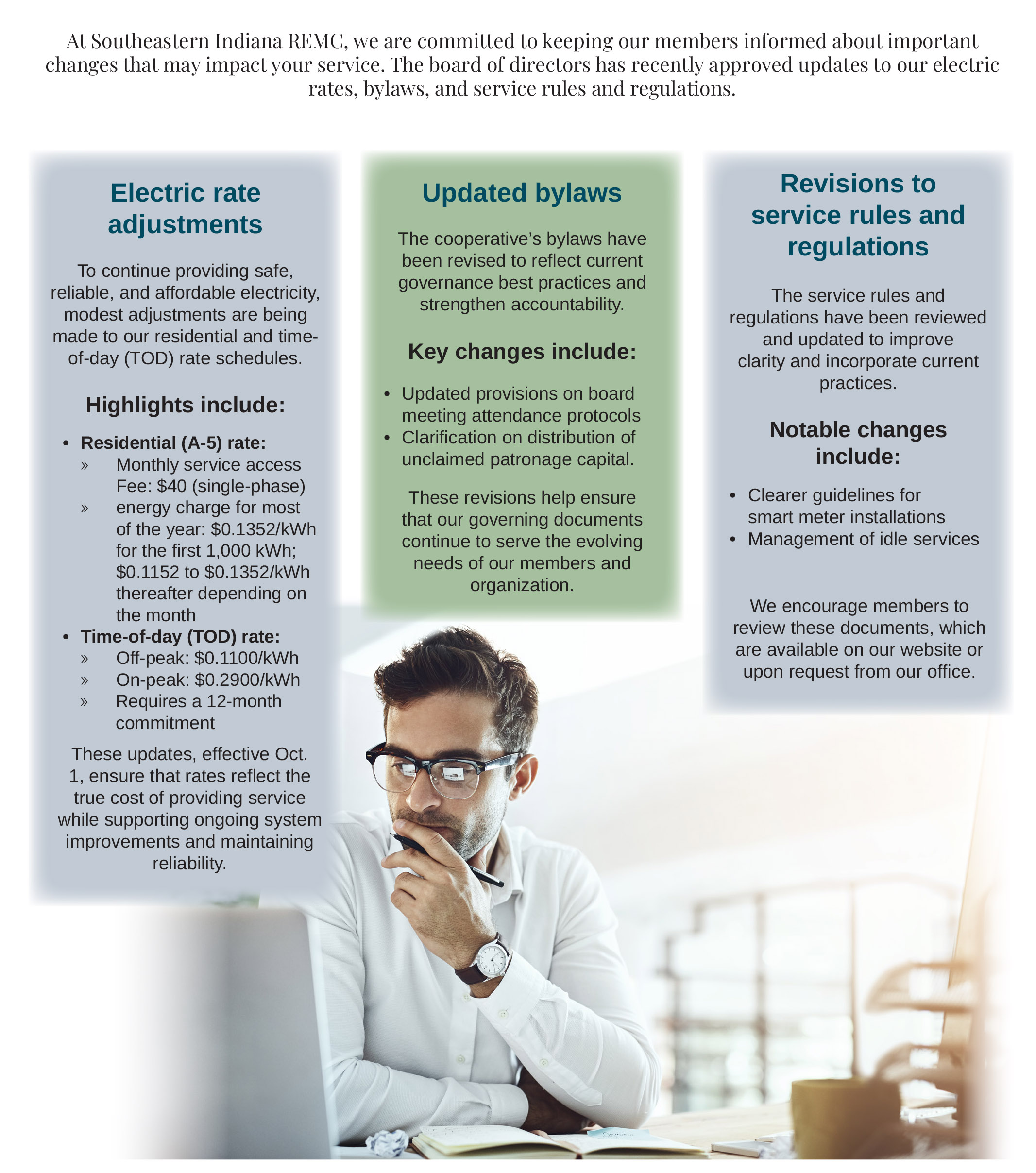 Updates to rates, bylaws and service rules: Here’s what you need to know By Indiana Connection Posted on Sep 21 2025 in Southeastern Indiana REMC Related Stories Advancing amid challenges Celebrating National Co-op Month UNDERSTANDING THE RATE ADJUSTMENT