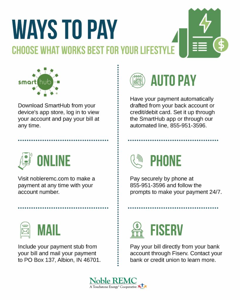 Ways to pay at Noble REMC By hhuffman Posted on Oct 26 2025 in Noble REMC Related Stories Reflecting on 2025, building for 2026 API invests and earns cash back Powered by purpose