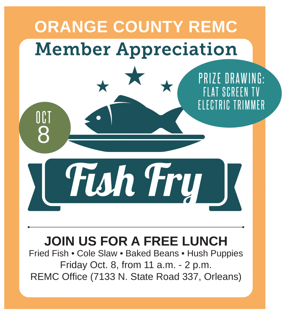 We appreciate you! Join us for a fish fry on Oct. 8 By Indiana Connection Posted on Sep 02 2021 in Orange County REMC Related Stories A season of gratitude and community 2025 Member Appreciation Day Join us for a Christmas toy drive