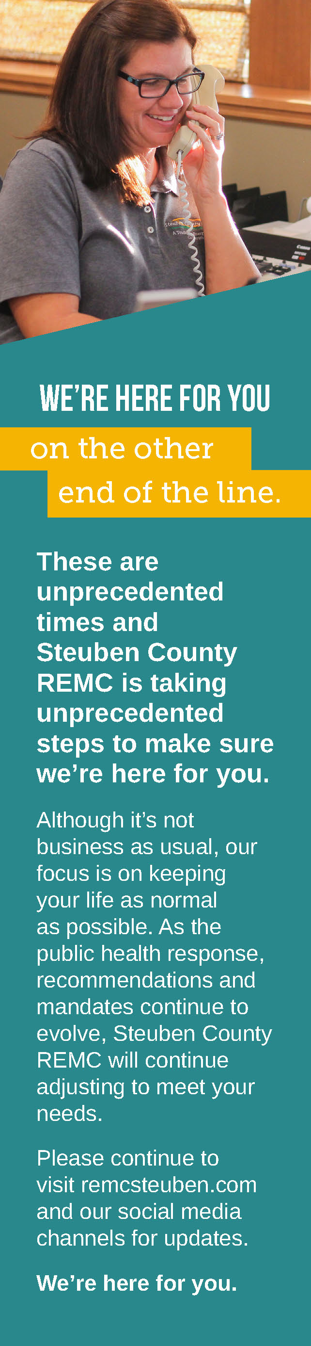 We’re here for you By Indiana Connection Posted on Jun 05 2020 in Steuben County REMC Related Stories Want to serve your community? Broadband internet for your home and business from Steuben County REMC Calendar