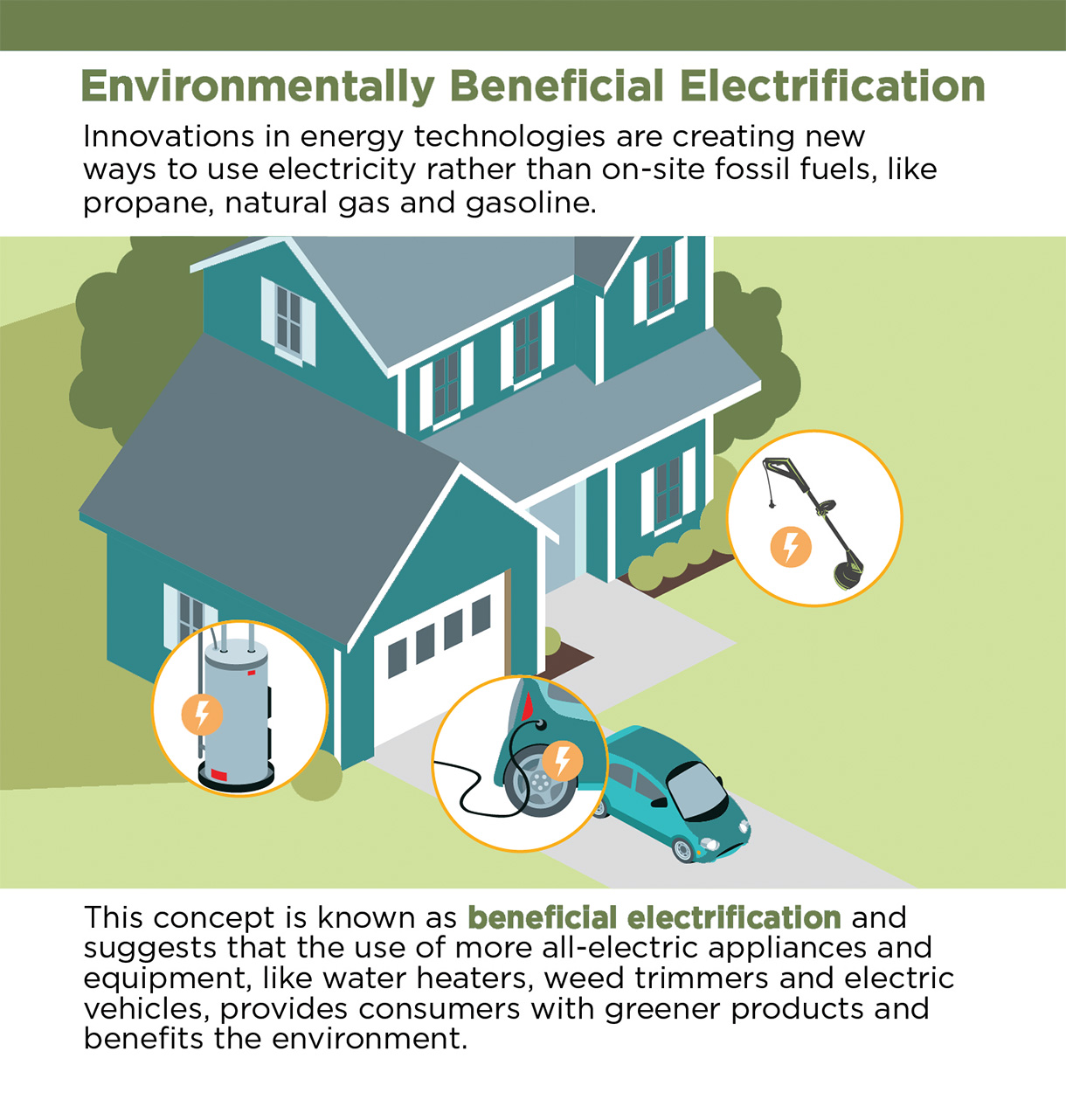 For consumers and homeowners looking for more environmentally-friendly energy options, choosing electric appliances over those powered by fossil fuels is an easy solution. Whether through electric lawn mowers, blowers and weed whackers (plug-in or rechargeable) or through electric water heaters and other appliances, beneficial electrification is a means to reducing greenhouse gases and helping the environment.