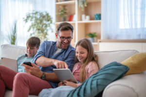 Father and children using electronic devices on sofa at home