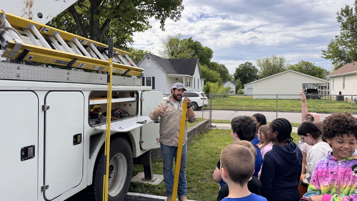 WIN Energy REMC visited students at Riley Elementary School in Vincennes for their Outside Career Fair. Classes had the chance to see one of our bucket trucks and learn about lineworker careers.