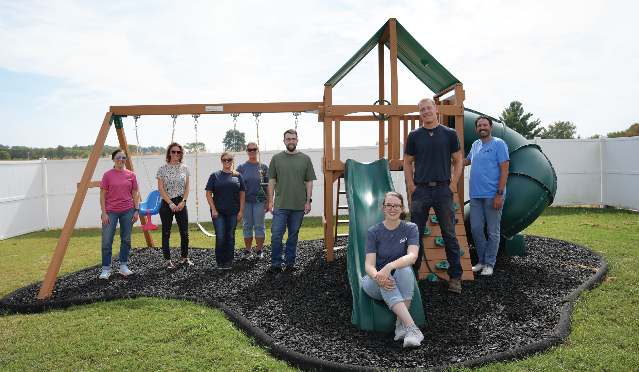 WIN Energy REMC employees and Jacquelyn Cunningham of Isaiah 117 House stand in front of the newly stained playset. Pictured from left: Leslie Beard, Jacquelyn Cunningham, Rebecca West, Caryn McCallister, Brayten Kaiser, Madeline Sievers, Drew Walden, and Colin Mahoney.