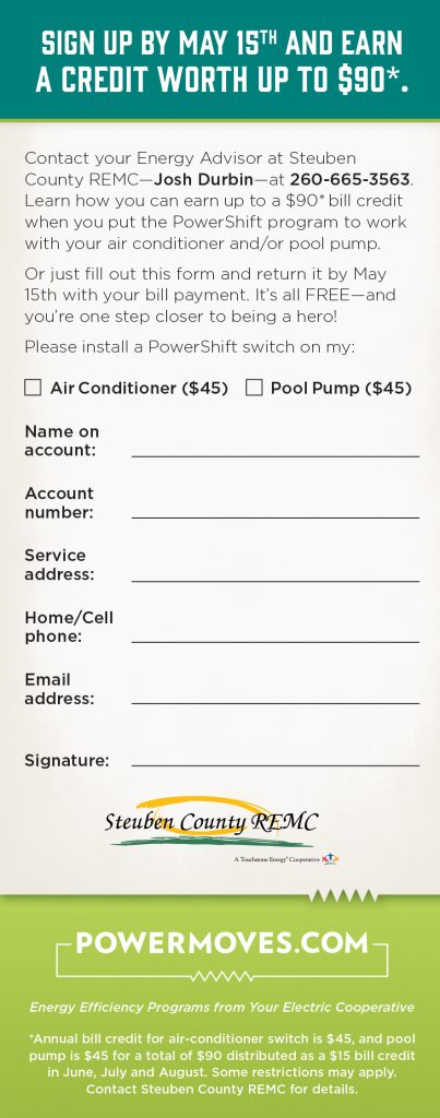 Call your local energy advisor, Josh Durbin at Steuben County REMC, at 260-665-3563. He has helped hundreds of members like you join the PowerShift program.