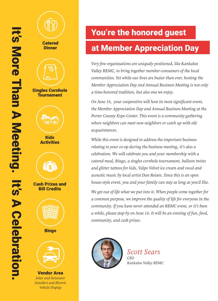 You’re the honored guest at Member Appreciation Day By Scott Sears Posted on May 29 2022 in Kankakee Valley REMC Related Stories Smart energy choices, shared savings KV REMC 2026 Scholarship opportunities Water heater switch program discontinues Jan. 1